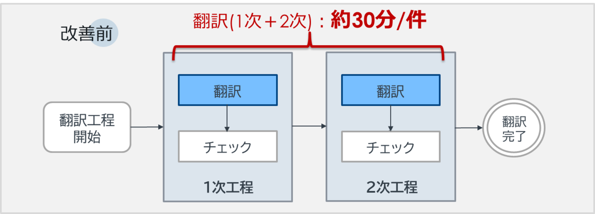 ある現場では、翻訳が必要な書類の処理に1件当たり約30分を要し、毎月100時間以上(月200件以上)もの工数が発生していました。このフローでは、品質確保のためダブルチェック体制を採用していますが、実質的には1次と2次の両方で独立した翻訳作業が実施されており、同一書類に対して2回の翻訳が行われている状況でした。